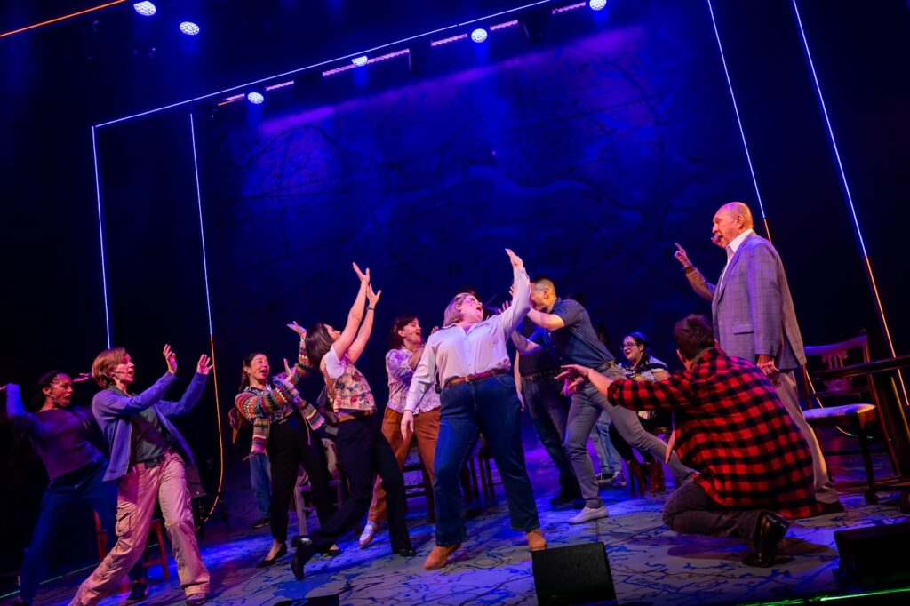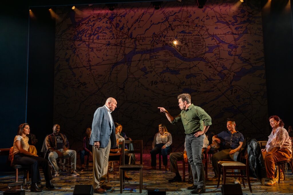 The Cape Playhouse presents Come From Away. Book, music and lyrics by Irene Sankoff and David Hein. Directed and Choreographed by Kelly Devine. Music Direction by Lena Gabrielle. Set Design by Alexander Woodward. Lighting Design by Kirk Bookman. Costume Design by Gail Baldoni. Sound Design by Walter Trarbach. Wig Design by Bobbie Zlotnik. At the Cape Playhouse, 820 Main Street, Route 6A, Dennis MA, through August 30, 2025.