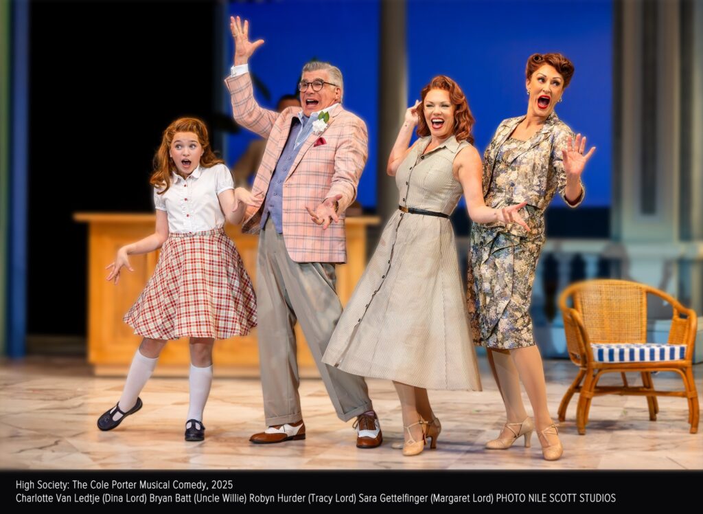 High Society is loaded with comic moments, the bulk of which are supplied by Tracy’s precocious tween sister Dinah Lord (Charlotte Van Ledtje) and Tracy’s Uncle Willie (Bryan Blatt). The set design by Alexander Dodge lends authenticity to the upscale digs of the Lord family, and Tracy Christensen’s costumes faithfully capture the era.