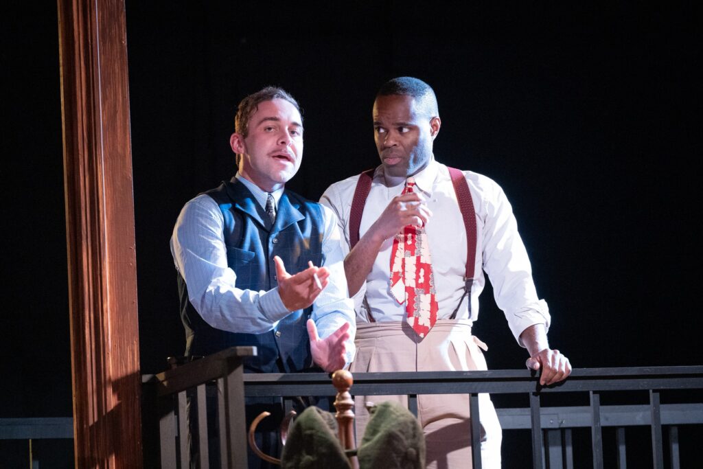 The Glass Menagerie is a seven-scene memory play with a storyline that follows Tom Wingfield (De’Lon Grant) as he looks back on his family life in St. Louis during the 1930s. In the opening scene, Tom appears slightly offstage to deliver his soliloquy. “The play is memory. Being a memory play, it is dimly lighted, it is sentimental, it is not realistic,” he says, warning that what he is about to share may not be THE truth, but it is certainly what he remembers (or thinks he does). “Yes, I have tricks in my pocket, I have things up my sleeve. But I am the opposite of a stage magician. He gives you an illusion that has the appearance of truth. I give you truth in the pleasant disguise of illusion.”