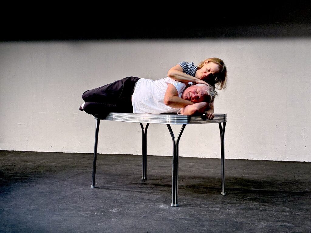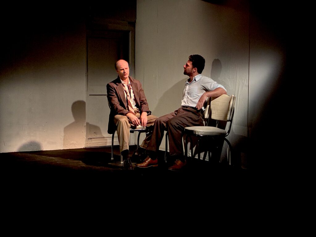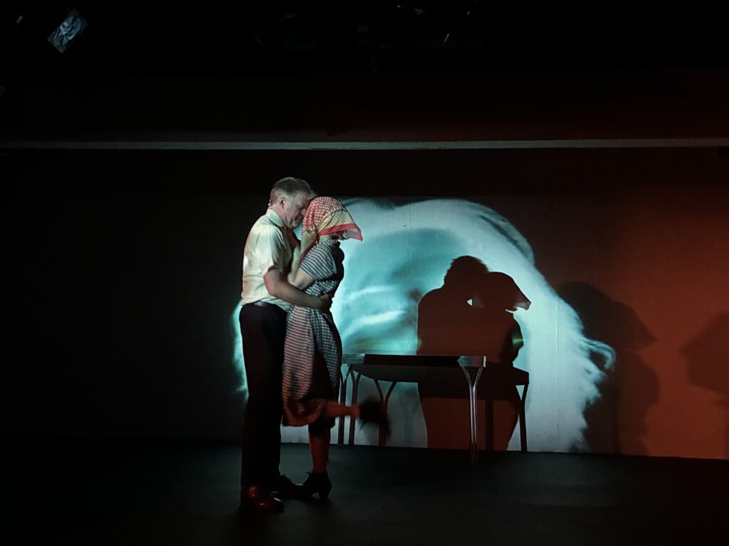 Director Robert Kropf has stripped the production down to its bare bones, including relying on live projected images of secondary characters and settings on the walls of the set in place of complicated scene changes (conversations with his helpful neighbor Charley, Willie’s hotel room in Boston, etc.), which can be a little confusing for those unfamiliar with the play. Scenic designer Justin Lahue’s set could not be more minimalist, with antiseptically white walls and a handful of props (literally four or five chairs and a multipurpose table), which, in conjunction with John Malinowski’s bold choices in the lighting design, creates a surreal atmosphere for conveying Kropf’s artistic vision.