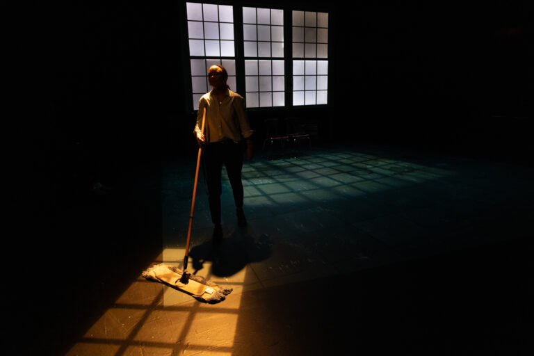 Janitor Baron, who functions as a Greek chorus of one, reflects on being the first black janitor at the school, and the long history he and it have shared through the political turmoil of the U.S., from the pristine institution that it once was to the neglected structure it has become.