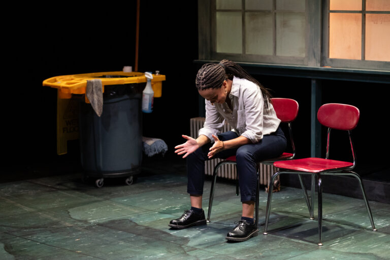 ‘No Child…’ — Written by Nilaja Sun. Directed by Pascale Florestal. Scenic Design by Cristina Todesco; Costume Design by Chelsea Kerl; Lighting Design by Amanda Fallon; Sound Design by Jacques Matellus. Presented by Gloucester Stage Company, 267 East Main St., Gloucester through August 23.