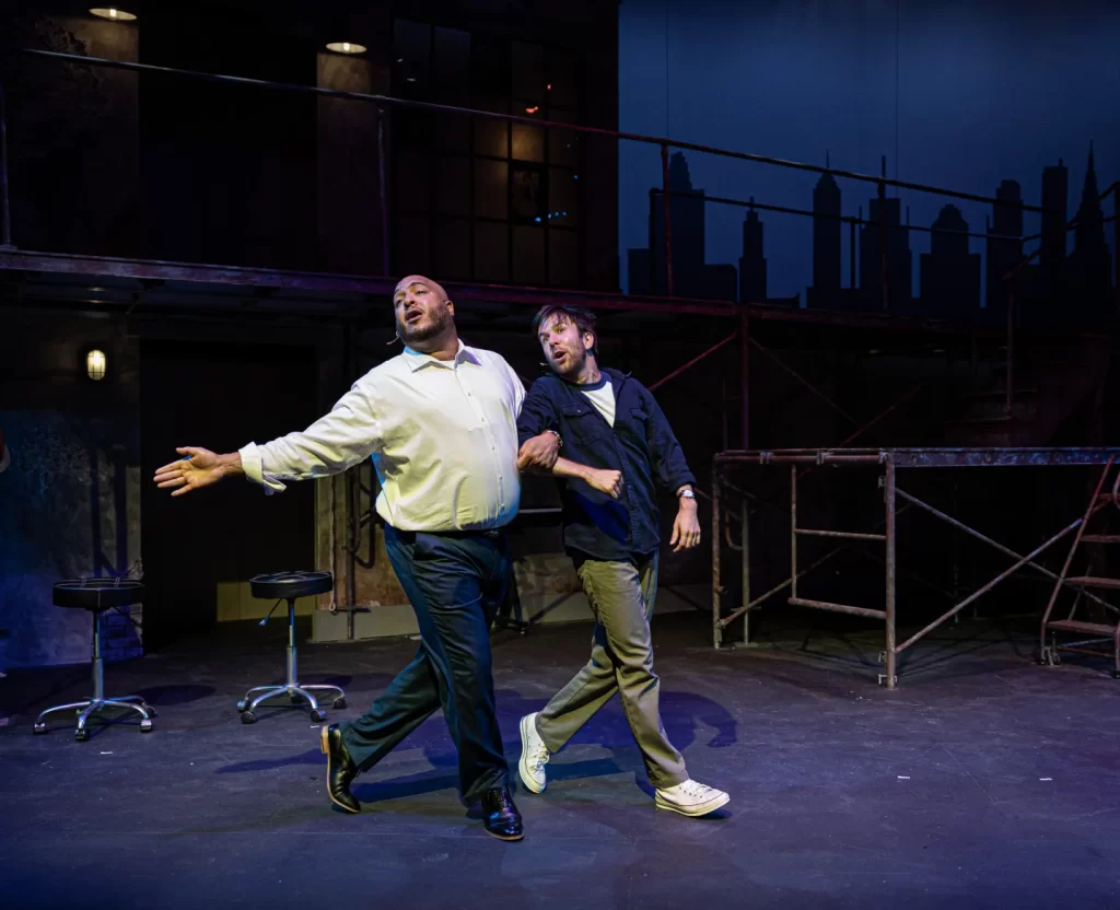 Ilyse Robbins directs her talented cast in an explosive, energetic ninety minutes, set against the backdrop of Erik D. Diaz’s expansive, industrial set, which is used to convey a dive apartment, an expensive rental unit, an office, a restaurant, a convenience store, and a theater. Shea really sells the character of Jon – we feel his angst, his elation, and his relief when he finally makes a decision. He has a terrific voice and imbues his musical numbers with passion. Anthony Pires Jr’s relaxed confidence is a nice antidote to Shea’s balled-up anxiety. The two men show off their dance abilities in the charming “No More”, with an easy chemistry. Calantropo is touching as the wistful Susan. She and Pires Jr play a host of other characters energetically and convincingly. The music, for the most part, alternates between dramatic and fun – “Sunday” is a laugh-out-loud sendup of Sondheim’s “Sunday in the Park with George” – with the exception of “Green Green Dress”, a silly number that makes frequent references to twenty buttons, that for some reason don’t exist on the dress used for the show.