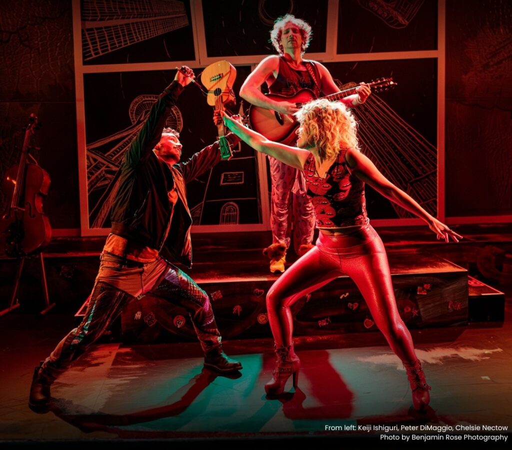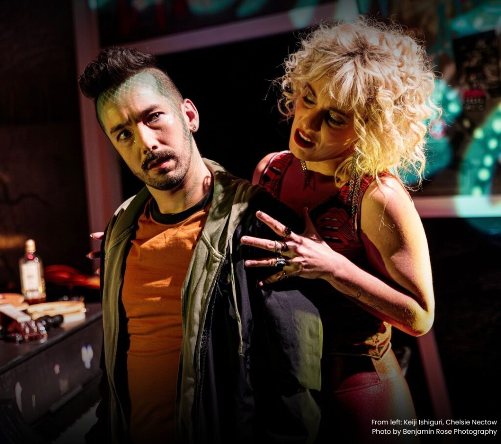 As Trevor, Ishiguri conveys a real vulnerability as the traumatized man/boy who doesn’t realize he’s a prisoner of his own fears, and DiMaggio brings a charming and kind goofiness to the role of Cary. Nectow, whose whiskey swigging Siren − clad in a skin-tight blood red outfit, complete with six-inch stiletto heels reminiscent of New Wave icon Dale Bozzio from Missing Persons – brings the requisite Patti Smith-esque snarl to the role, and when she tells Trevor, “I’ll let you sing me one song, and then I’ll kill you,” it’s simultaneously humorous and menacing. Scenic designer Qingan Zhang has created a multifunctional set highlighted by the backdrop of a punk rock club straight out of the CBGBs/Rat era. Zoë Sundra’s costumes perfectly capture the retro Seattle vibe (and Cary’s “Sexy Baby” outfit is a scream).