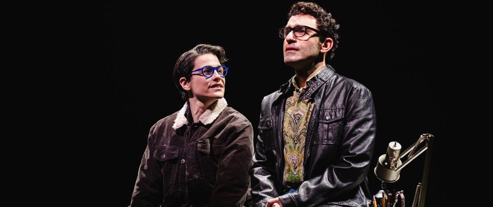 Suddenly, Small Alison’s head pops up out of the drafting table. Kron’s narrative lyrics both highlight Bockel and clue us in about her character. Alison is trying to make sense of her childhood and the larger-than-life role her father, Bruce (a knockout Nick Duckart), played in it. At the center is Alison’s joy at discovering she is a lesbian, her first year in college, and Bruce’s tortured and shamed existence as a closeted gay man living as an outwardly “normal,” heterosexual, family man. His suicide (he stepped in front of a truck) only elevated his importance in Alison’s pursuit of answers to the question, “What happened to us?” If she could only unlock the mysteries surrounding his life, perhaps she could understand those surrounding her own.