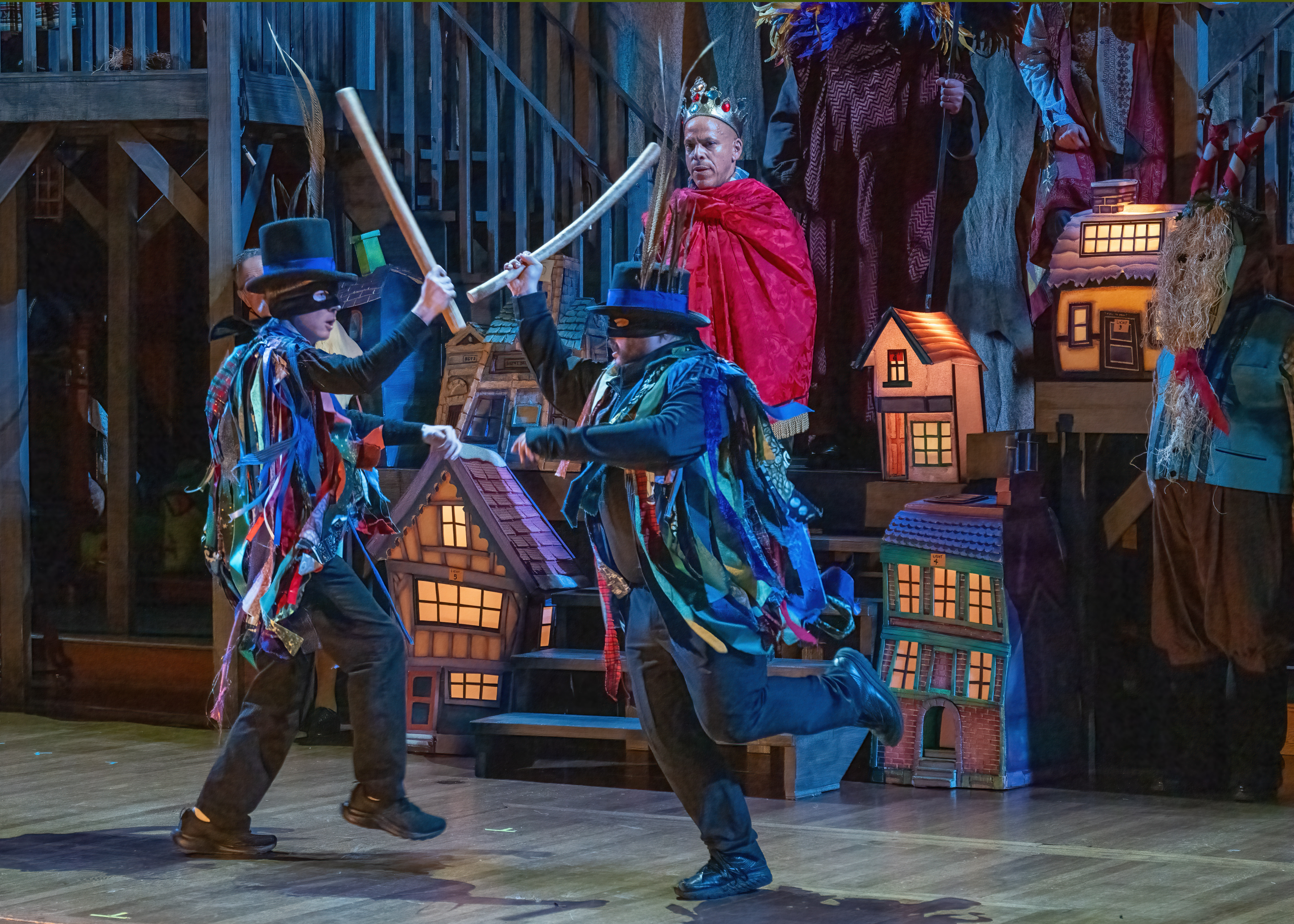 The story begins with a poor boy named Frederick (David Keohane) who lives with his mother, Dame Pederson (Kristian Espiritu), seamstress to the Queen. They don’t have enough matches to light their stove, so one of them has to sit up all night and make sure the flame doesn’t go out. Frederick is working on a secret project, a village made entirely from scraps he’s salvaged from the street. Concurrently, the Little Match Girl (Eliza Fichter) is having a fruitless day; she’s lost her shoes, the only keepsake she has from her dead mother, and not a single customer has bought a match. In a twist of fate, Frederick has also found one of the Little Match Girl’s lost shoes, which has a key and an address in it. While the Little Match Girl’s fate is tragic, Frederick’s and his mother’s are serendipitous, thanks to where the address leads them. The story is interspersed with scenes from the Queen’s court, celebrating Christmas Eve with a story told by none other than Hans Christian Andersen (Keohane) using colorful cardboard cutouts and a good-natured member of the audience to illustrate a pointed “Emperor’s New Clothes”. There’s also a Mummer’s Play, which features creatures from Norse mythology and Scandinavian tales.