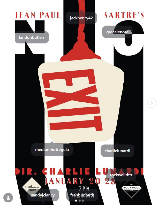 ‘No Exit’ by Jean-Paul Sarte. Directed by Charlie Lunardi. Stage Management from Jack Henry Yeatman. Scenic Design by Jayoung Hong. Sound Design by Z Toto. Lighting Design by Alyssa Gonzalez. Prop Design by Melinda Kalanzis. Costume Design by Gaby Obando. Deadword Theatre Company’s ‘No Exit’ runs from January 20th – 21st and January 27th – 28th at the Rockwell Theatre, 225 Elm Street, Somerville MA 02114.