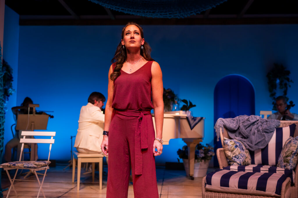 Janie E. Howland’s set conjures up the beauty of the Greek islands, in Santorini blue and white. I don’t think I’m giving away the ending when I tell you that Odysseus eventually makes it home, a scene that Doherty manages to play tenderly, even without a live scene partner. Somehow, it works. As she lies next to the invisible, sleeping Odysseus, his lack of physical presence hangs in the air, like a question mark. Where has he been? What has he experienced? All Penelope has is her love and her faith, which apparently is enough.