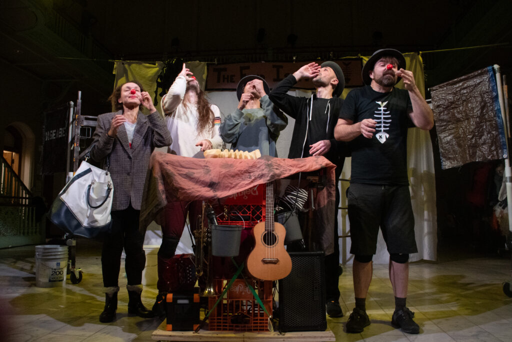 Jason Slavick: Clown and physical theater give permission for a playfulness and allow you to get closer to things that would be a lot harder in realism. The impulse to make this play really came out of despair. The only thing to do is laugh about it. In the process, that evolved from a cynical laughing, as in ‘we’re all going down the drain’, into a path toward hopefulness. When you code things as cartoon violence, or as cartoon logic, it’s language that most people in our culture know, having grown up on those things. As an artist, and also as an audience, it lets your guard down, and then you can get closer to a thing, and you’re laughing at the thing — but you know the real thing behind it. I like to use comedy like that to let you in the door, let you get close to a thing, then transform it into the serious thing and grapple with it. And I like to end my plays with a question and a hope, because I don’t have answers. I do feel like we’ve got to do something; that’s part of our responsibility as artists, to grapple with the world and go somewhere with it.